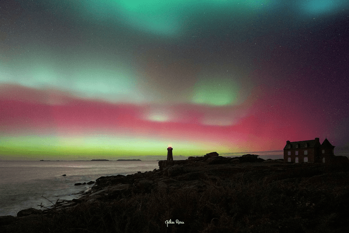 Grâce à de larges éclaircies et sa position géographique relativement septentrionale, le nord de la Bretagne a tiré son épingle du jeu et fut l'un des meilleurs endroits du pays pour observer les aurores boréales. Sur la côte de Granit Rose, le spectacle fut remarquable comme le montre le cliché du photographe Mathieu Rivrin. Outre le rose, couleur la plus facile à observer à nos latitudes, le vert s'est aussi largement invité dans le ciel. On pouvait observer les aurores à l'œil nu, bien que les appareils photos font davantage ressortir les couleurs.