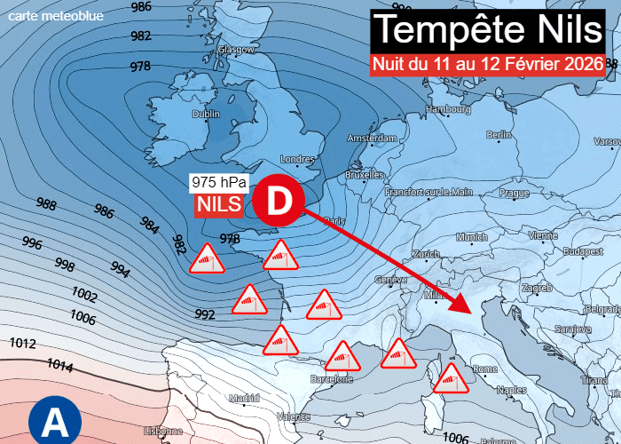 Associée à un vaste zone dépressionnaire, la tempête Nils se présentera sous la forme d'un minimum dépressionnaire qui se creusera au large de nos côtes atlantiques ce mercredi 11 février 2026. Ce dernier s'enfoncera en Manche durant la nuit du mercredi 11 au jeudi 12 février avec un cœur centré autour de 975 hPa. La dépression se décalera ensuite vers le nord de l'Italie. Les vents les plus forts frapperont d'abord l'arc atlantique avant de s'enfoncer sur le sud-ouest de la France puis le bassin méditerranéen.
