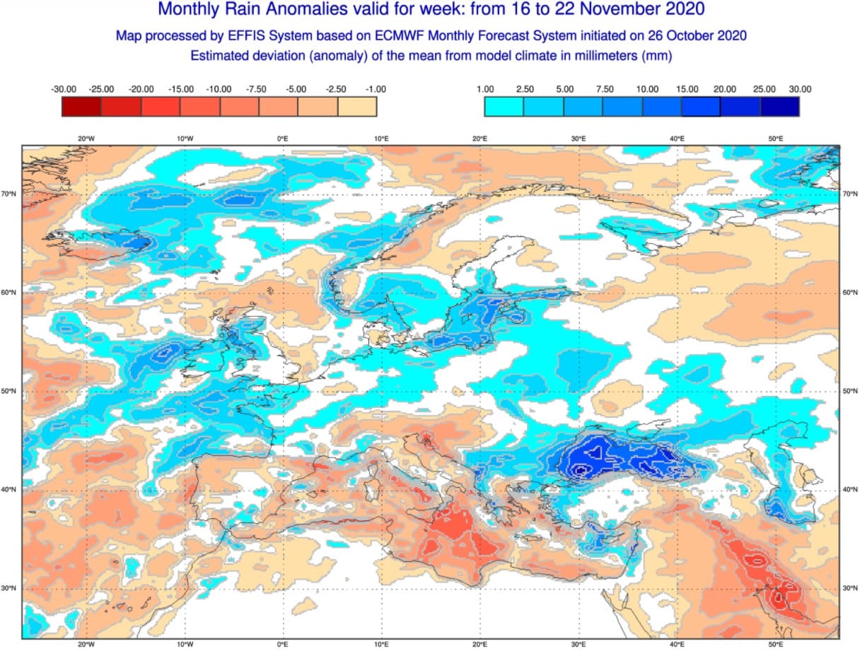 Anomalies de précipitations sur l'Ouest de l'Europe durant la semaine du 16 au 22 Novembre - Modèle ECMWF via EFFIS