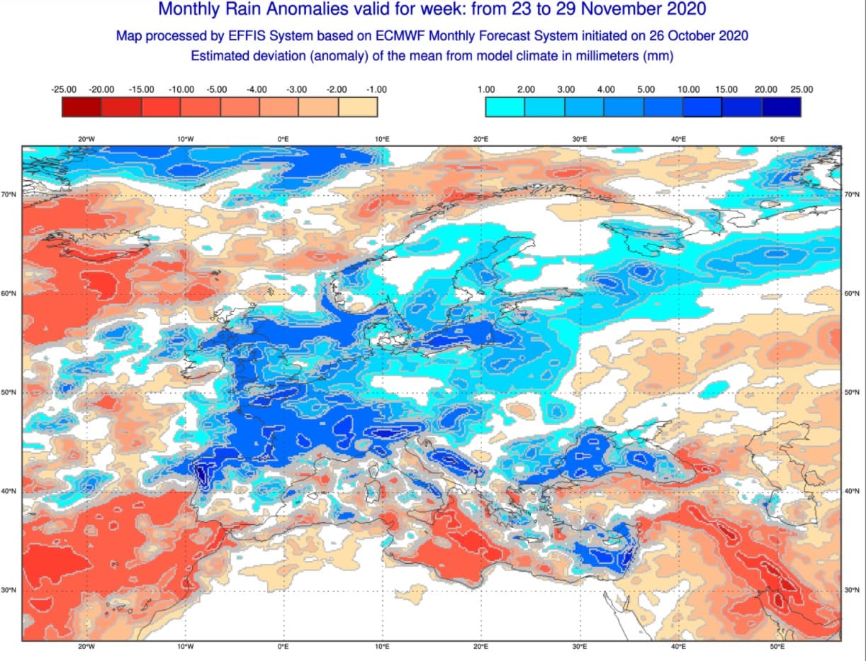 Anomalies de précipitations sur l'Ouest de l'Europe durant la semaine du 23 au 29 Novembre - Modèle ECMWF via EFFIS