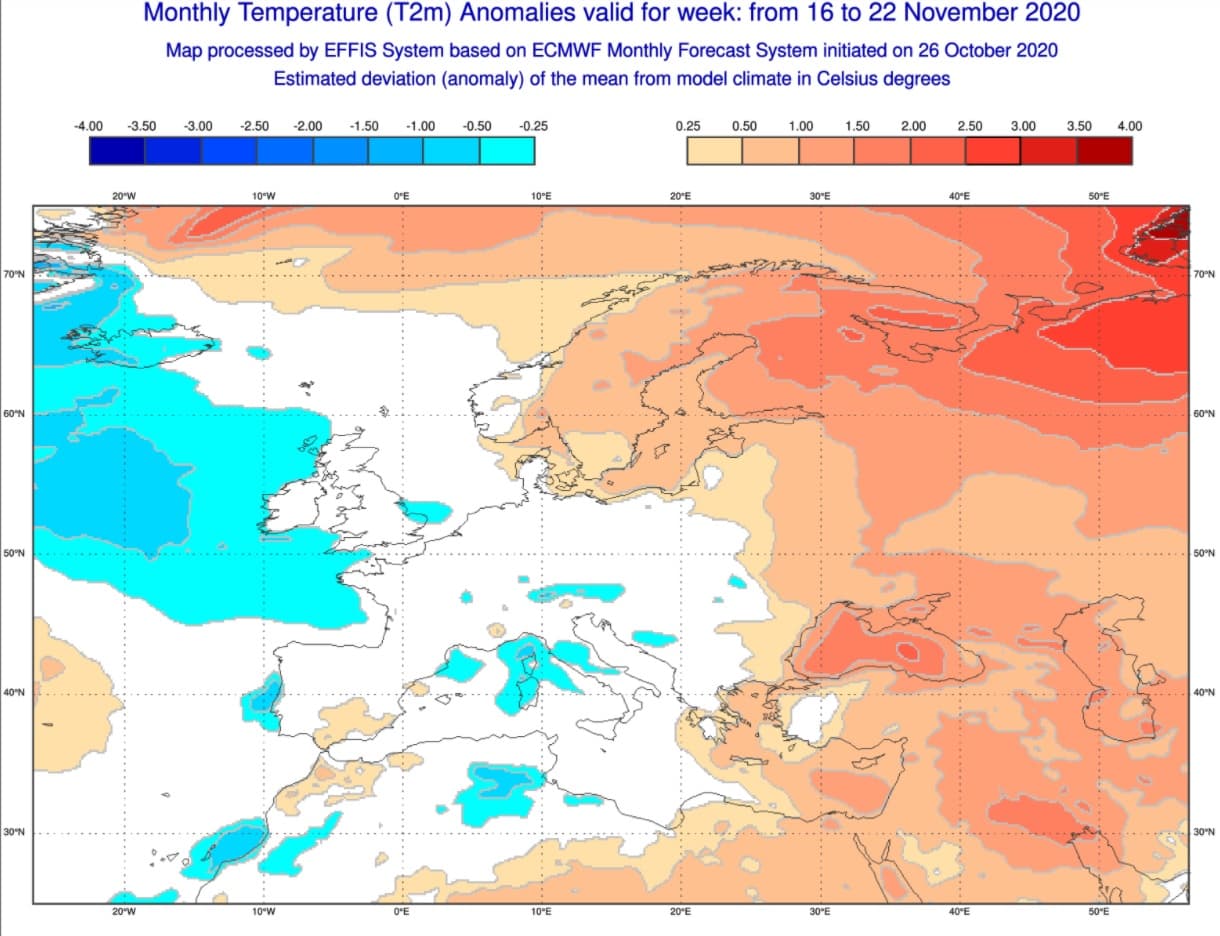 Anomalies de températures sur l'Ouest de l'Europe durant la semaine du 16 au 22 Novembre - Modèle ECMWF via EFFIS