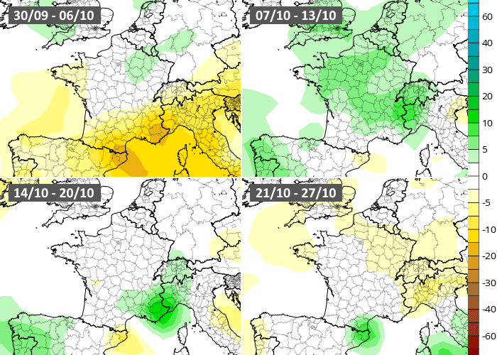 En ce qui concerne les précipitations, le modèle européen envisage une première semaine d'octobre 2024 instable. Il projette un excédent pluviométrique sur toutes les régions du nord et de l'ouest. Ensuite, aucune anomalie franche ne se dessine pour les deuxième et troisième décades du mois. De légers excédents pluviométriques sont parfois modélisés sur les régions du nord, le proche-Atlantique ou l'Europe Centrale, ce qui semble exclure la formation d'un anticyclone durable sur nos régions.