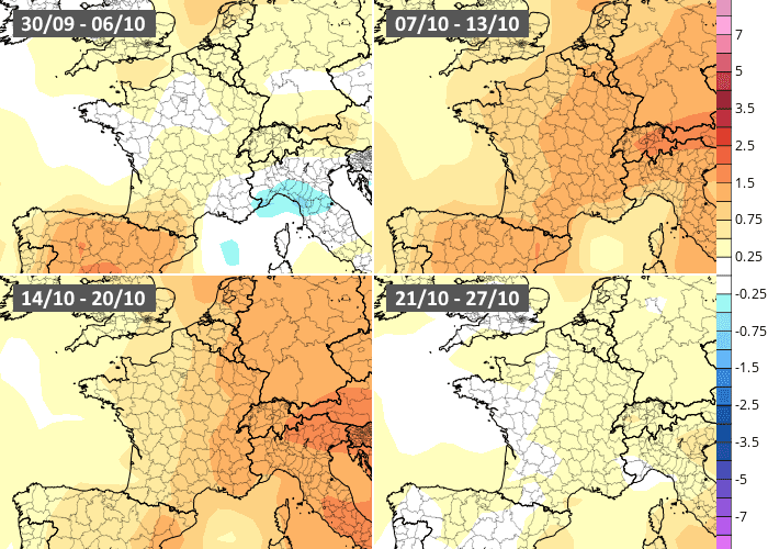 Anomalies thermiques hebdomadaires en octobre 2024 selon le modèle européen - ECMWF