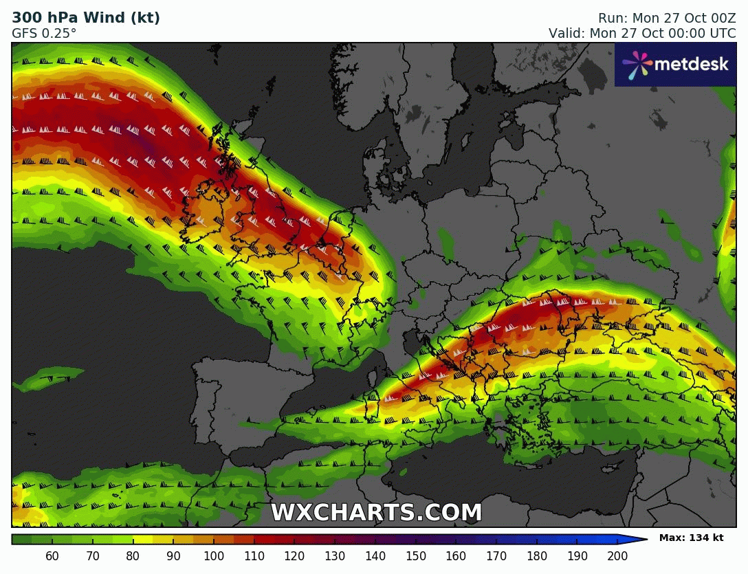 Animation du courant jet sur l'Europe du 27 octobre au 2 novembre 2025 – Modèle GFS via WX CHARTS