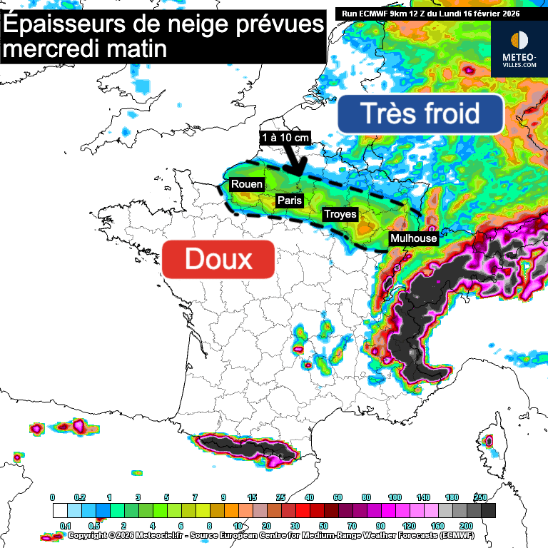Selon les cartes de prévision des épaisseurs de neige du modèle météo européen pour mercredi matin, il pourrait tomber entre 1 et 10 cm de neige dans cette zone. Cependant, cette carte pourrait exagérer les chutes de neige, comme ce fut le cas lors de l’épisode de dimanche matin.  Ces prévisions dépendent évidemment du conflit, mais surtout des températures. Il est donc possible que seuls les plateaux situés à plus de 100 m d’altitude soient blanchis. Dans ce type de situation, Paris ou la vallée de la Seine connaissent généralement des températures trop élevées pour que la neige tienne réellement au sol.