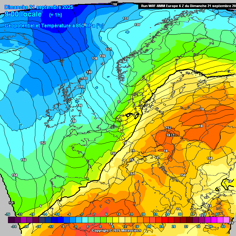 Évolution de la température de la masse d'air à 850 hPa jusqu'à vendredi 26 septembre - modèle Météo WRF - site METEOCIEL