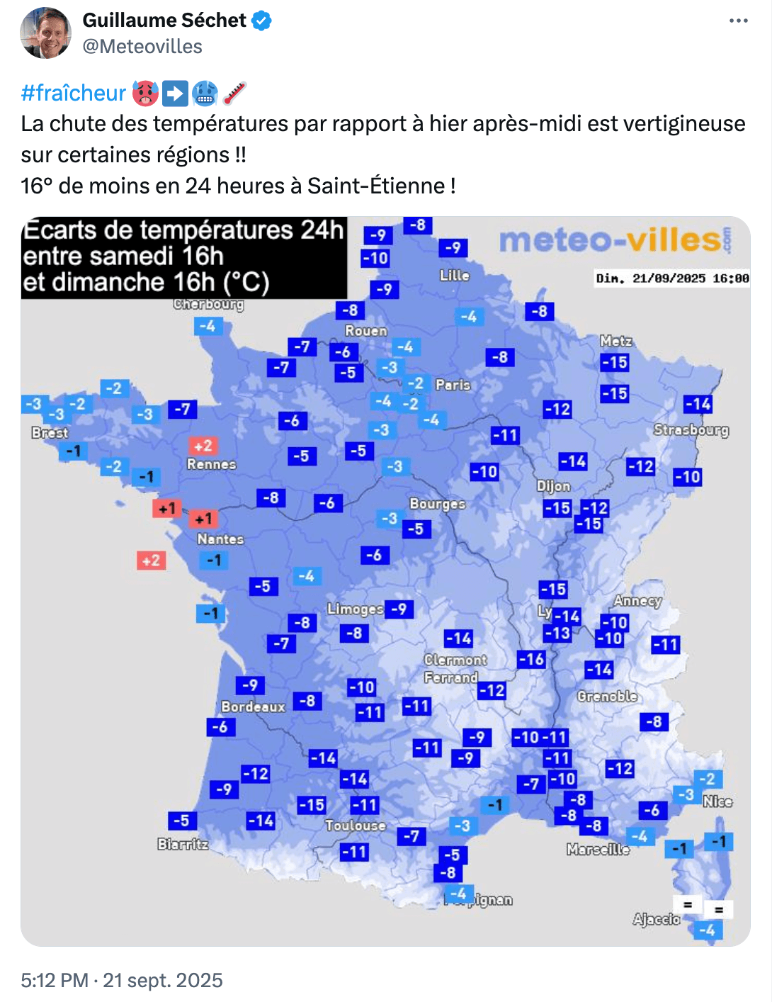 Les températures maximales prévues ce dimanche 21 septembre (valables jusqu'au samedi 27) seront généralement inférieures à 20°C, et même comprises entre 11 et 15°C du Nord-est au Massif-central jusqu'en fin de semaine… Certaines villes des régions méditerranéennes seront également concernées par cette fraîcheur.
