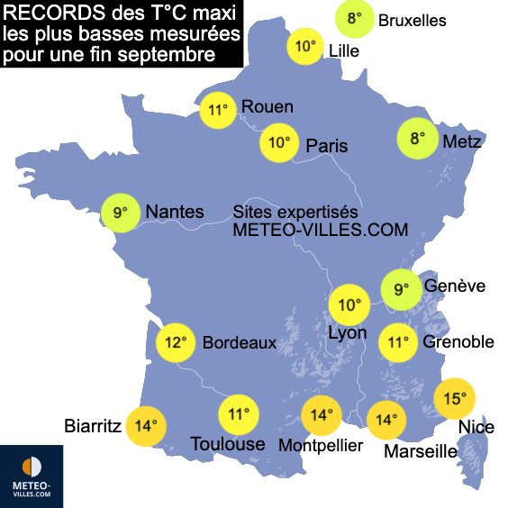 Records des températures maximales les plus basses mesurées pour une fin septembre (du 20 au 30 septembre) depuis le début des mesures - selon les tableaux climatologiques proposés dans chacun des sites expertisés de meteo-villes.com
