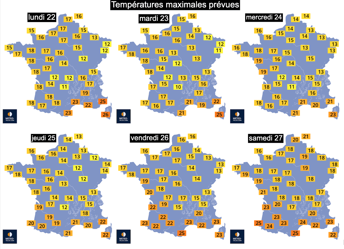 Prévisions des températures maximales quotidiennes entre lundi 22 et samedi 27 septembre selon notre site meteo-villes.com