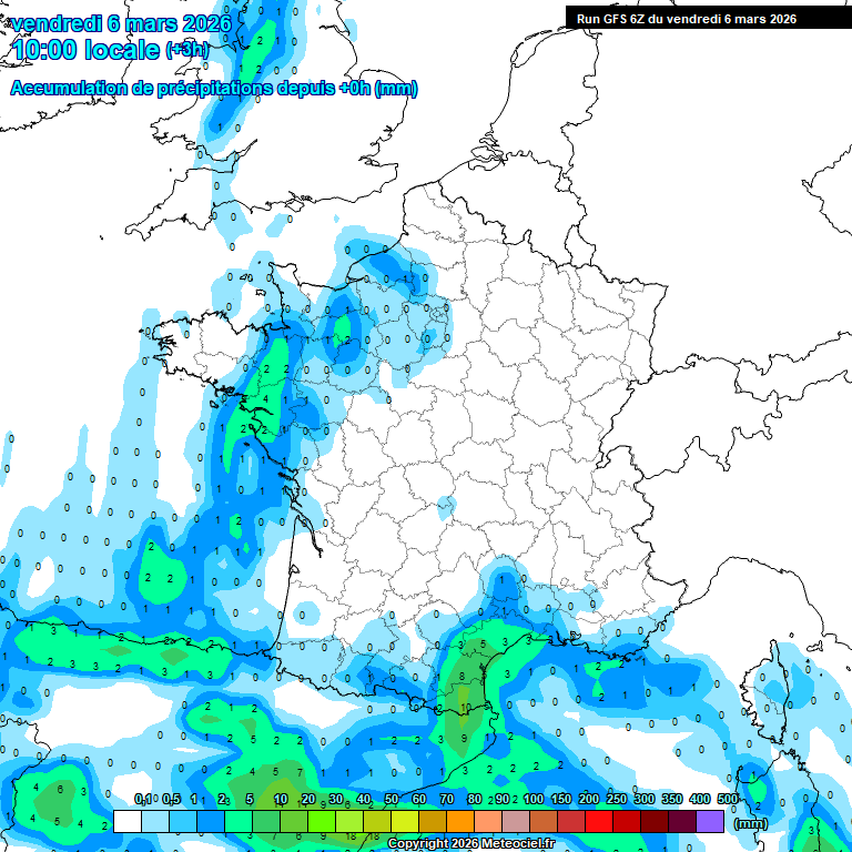 Animation des cumuls de précipitations jusqu'au vendredi 13 mars sur la France – Modèle GFS via meteociel