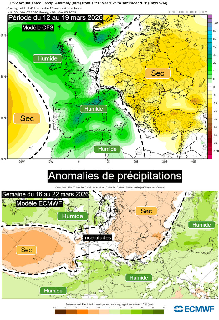 Anomalies de précipitations sur l'Europe entre le 13 et le 22 mars 2026 – CFS et ECMWF