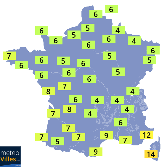 De ce fait, les températures vont retrouver des valeurs bien hivernales sur de nombreuses régions pour le jour de Noël avec même un risque de giboulées et de neige à basse altitude sur le Nord et l'Est du pays. On ne dépassera pas 3 à 5°C le 25 décembre du Centre-Est au Nord/Nord-Est. Nous relèverons en général 5 à 7°C sur le reste des régions du Nord et du Sud-Ouest et seule la méditerranée retrouvera localement des valeurs supérieures à 10°C.