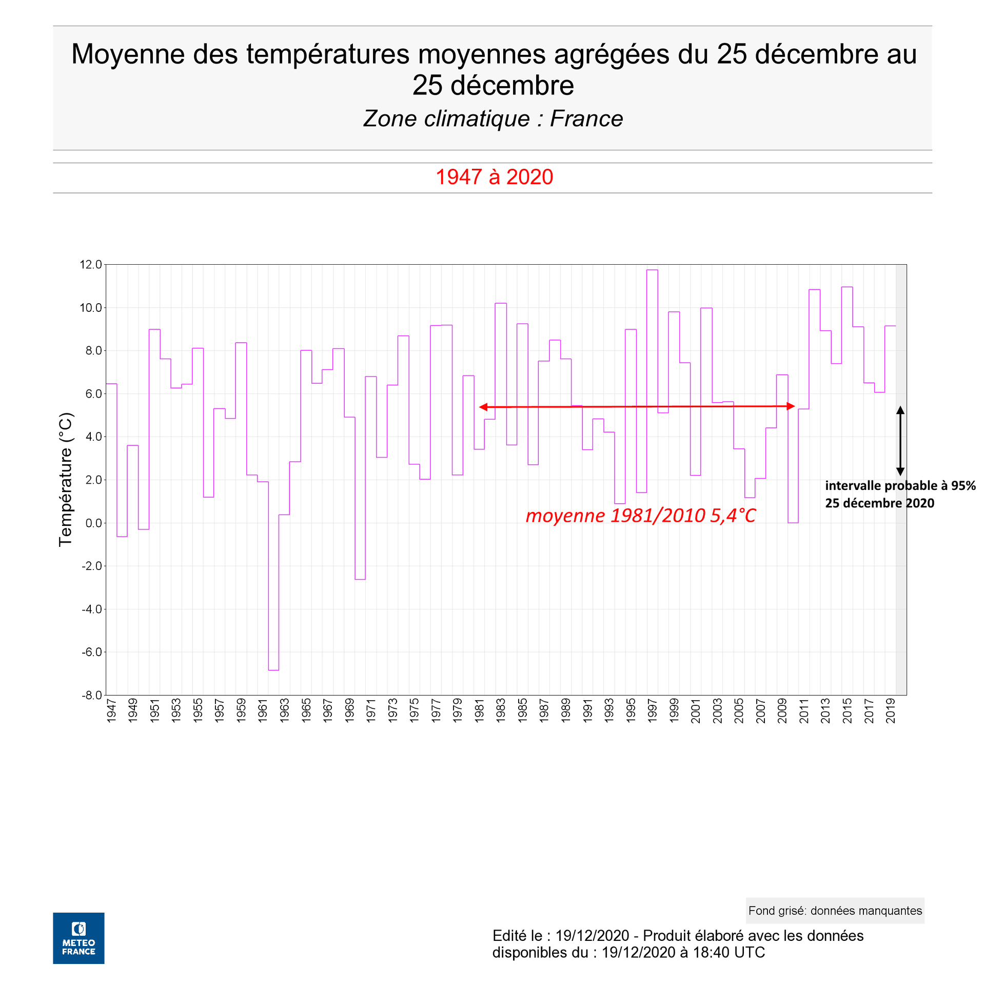 Graphique de la moyenne des températures agrégées au 25 décembre en France depuis 1947 – Météo-France