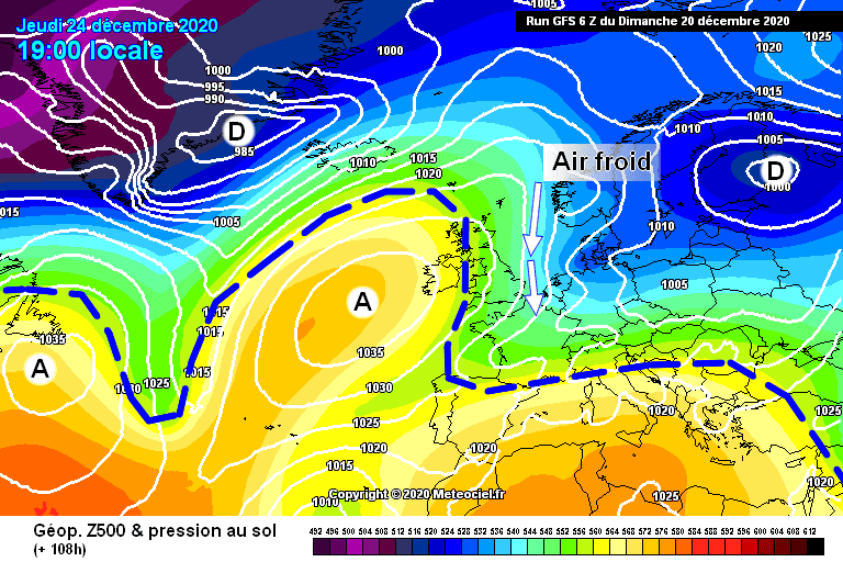 Schéma de la situation atmosphérique du jeudi 24 décembre sur l’ouest de l’Europe – Modèle GFS via météociel.fr