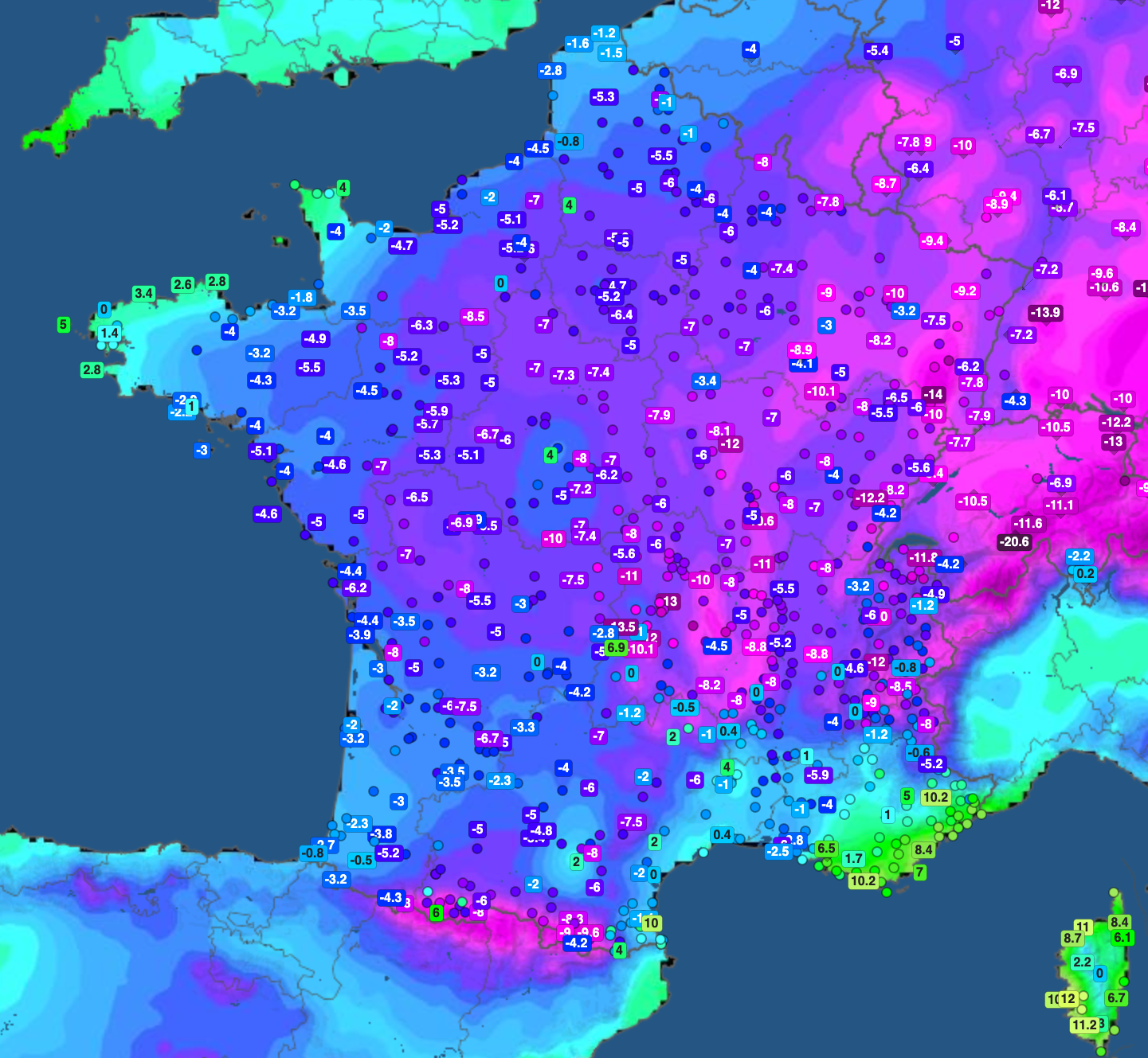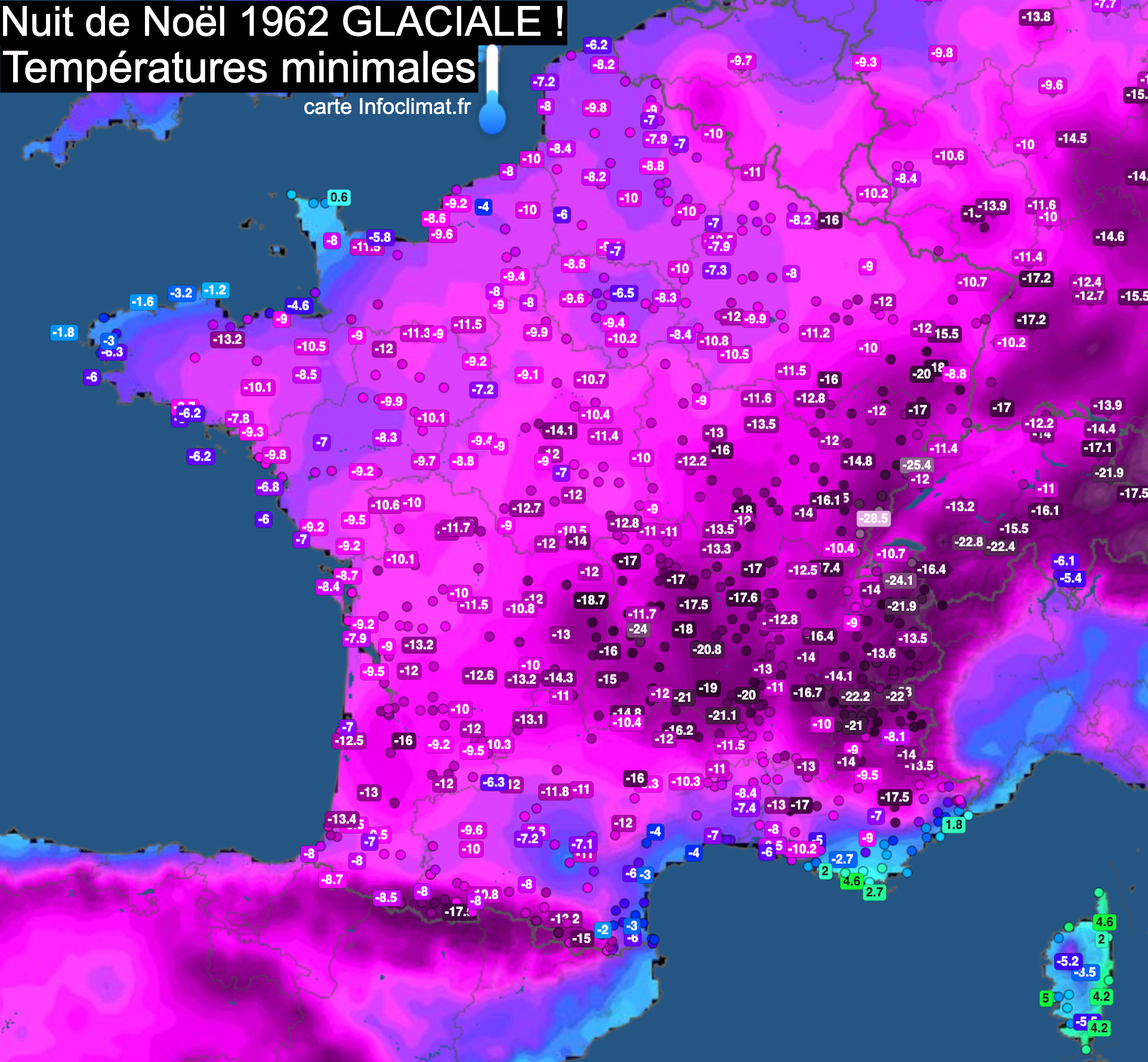 A partir du 22 décembre 1962 (Pour plus de détails sur le long hiver 1962-1963): un froid polaire déferle sur toute l’Europe - les gelées sont permanentes sur absolument toute la France - le réveillon de Noël 1962 est le plus froid du 20eme siècle avec -15° à Bordeaux et -9° à Biarritz. 1m de neige recouvre Barcelone, en Espagne - pratiquement toute la France est paralysée par le froid et la neige - les canaux et rivières gèlent peu à peu - certains fleuves comme le Rhin, le Rhône et la Seine charrient des glaçons à partir de la fin du mois de décembre 1962 - un redoux temporaire concerne la moitié sud entre le 28 et le 31 décembre 1962.